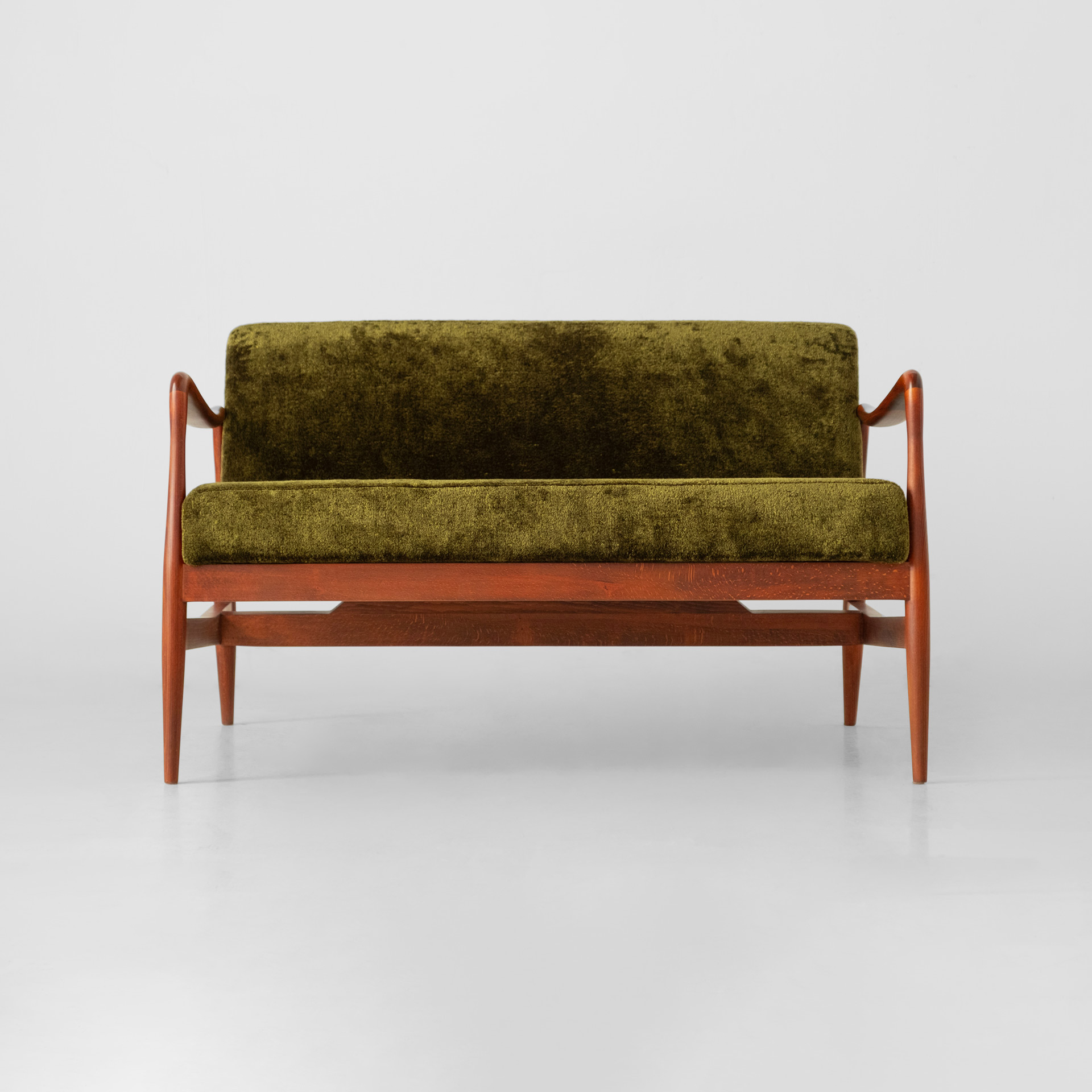 The main highlight in the construction of this sofa is the connection of the wooden armrests to the cylindrical legs.
