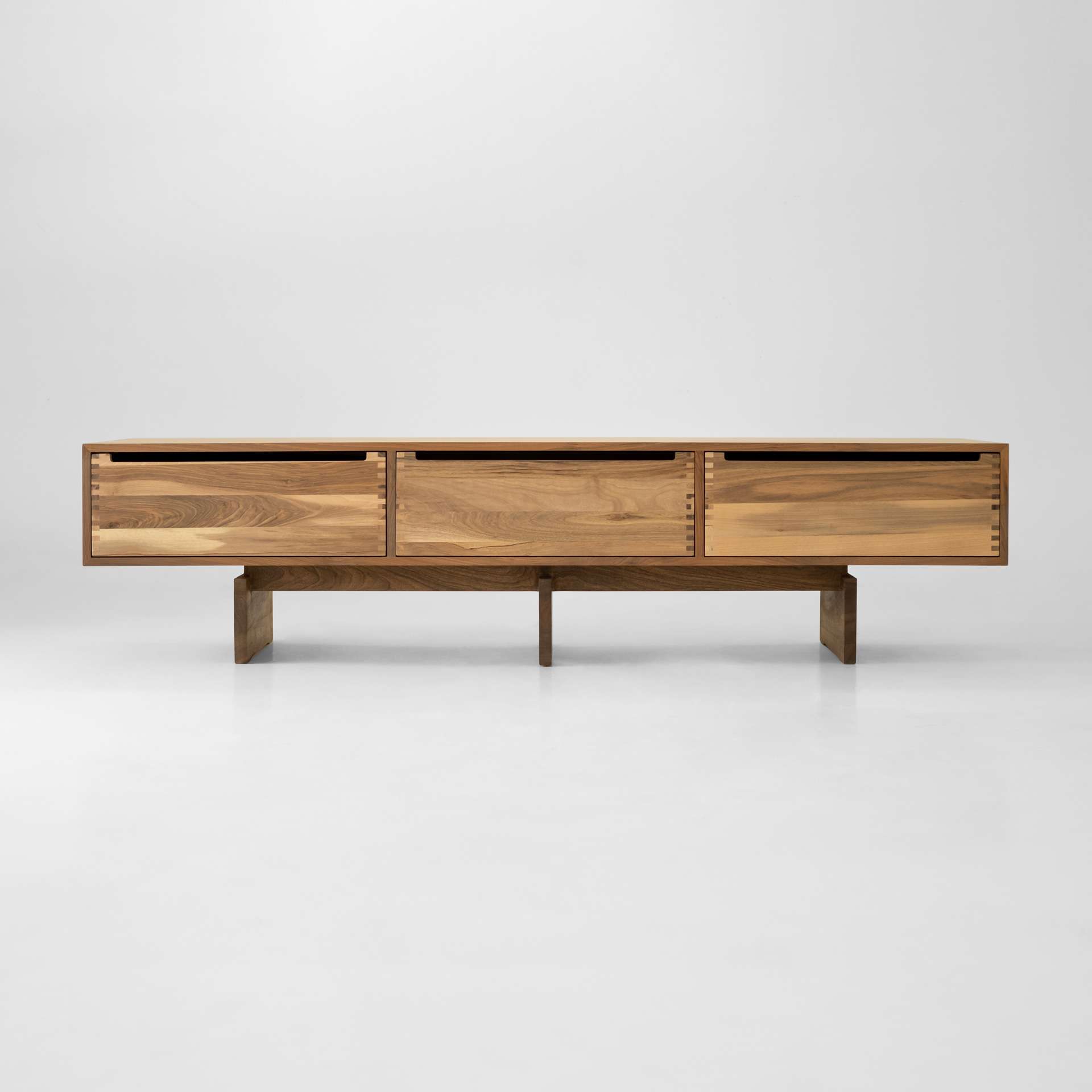 The doors, drawers, and legs are crafted entirely from solid walnut, paired with a walnut veneer body for a cohesive look.