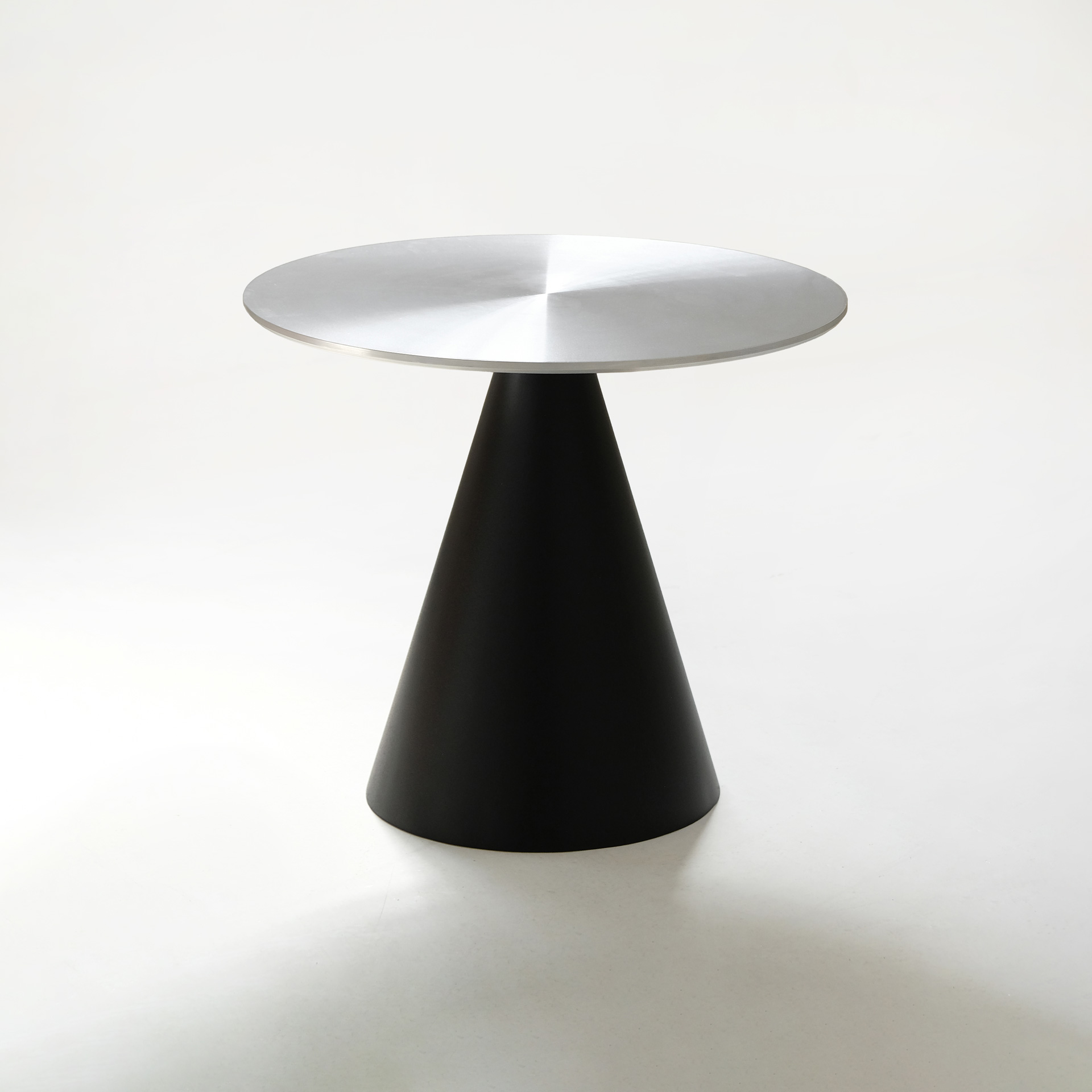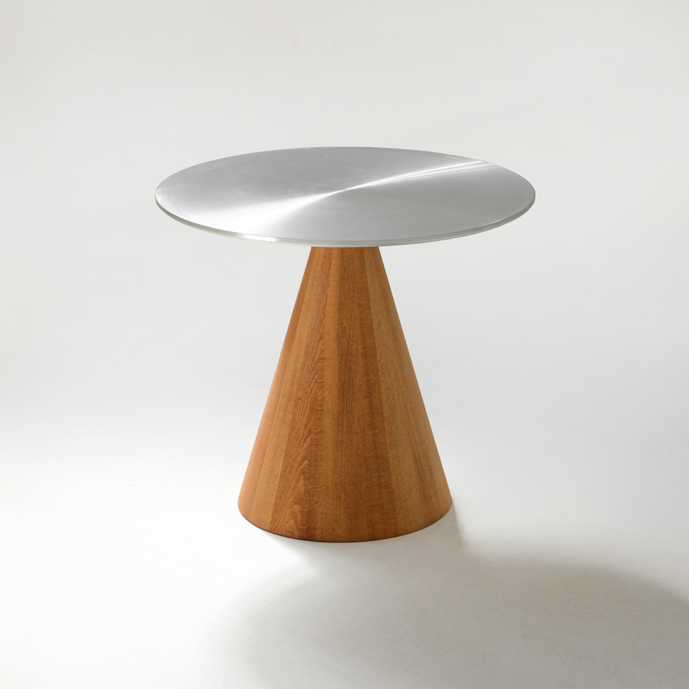 The "Mushroom" side table, with its contemporary aluminum top and conical beech wood base, creates a striking balance between industrial texture and natural warmth. Its design is both minimal and distinctive, a form inspired by nature, approached with modern sensibility.