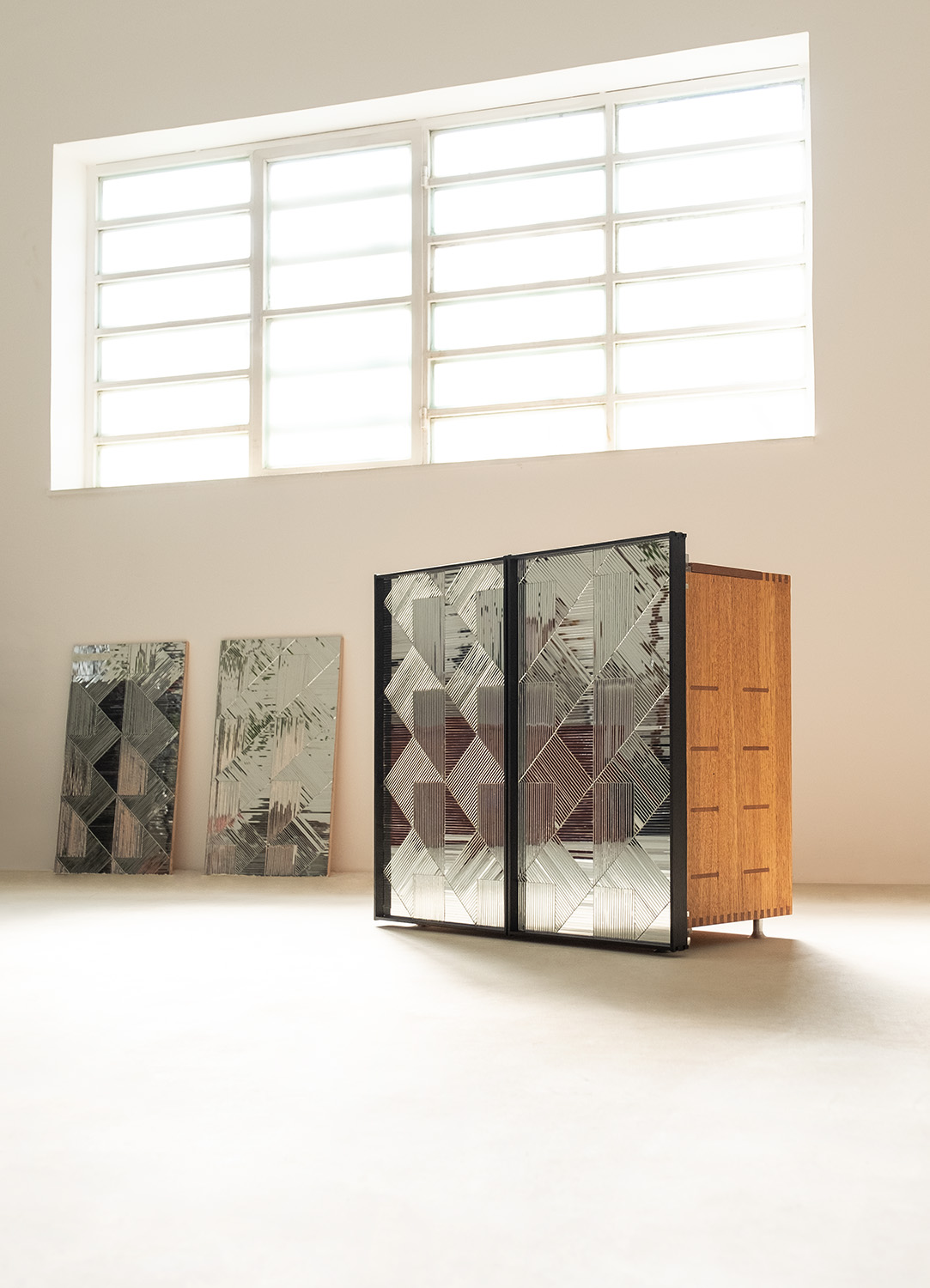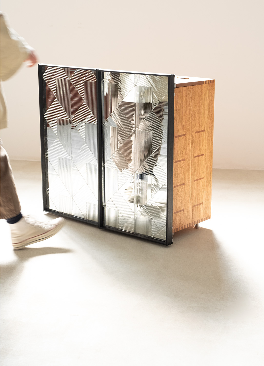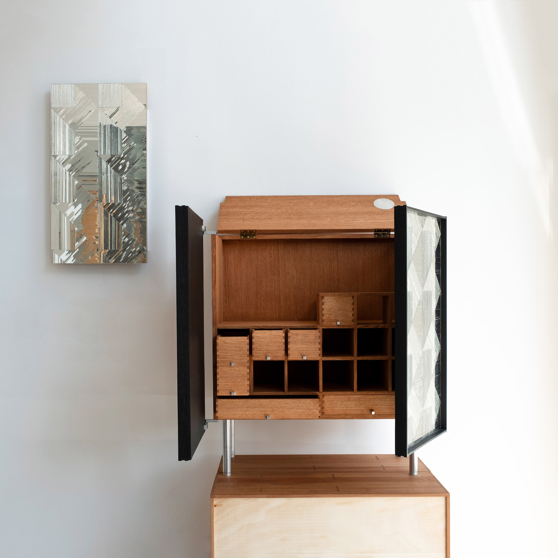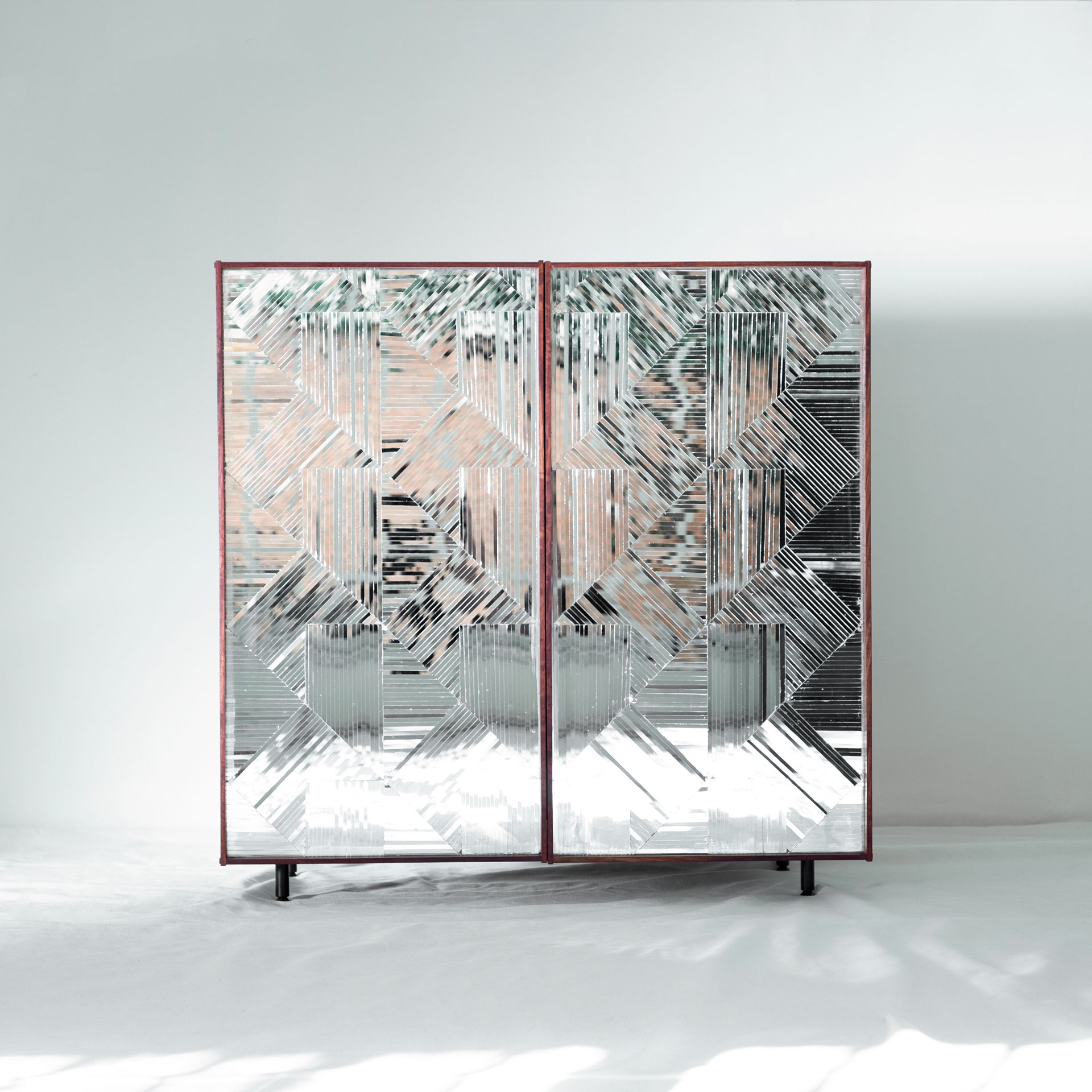 Ayyine Kari (mirror work) is an Iranian traditional craft. Craftsmen cuts mirror with their hands and stick pieces on a surface. This technique was used for adorning holy shrines in the past. Hand-crafted storage (home-bar) adorned with “ Ayyine Kari ”.