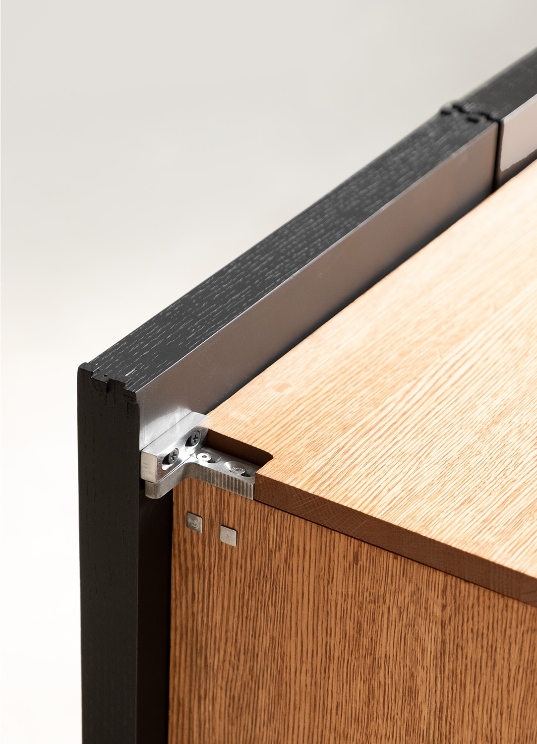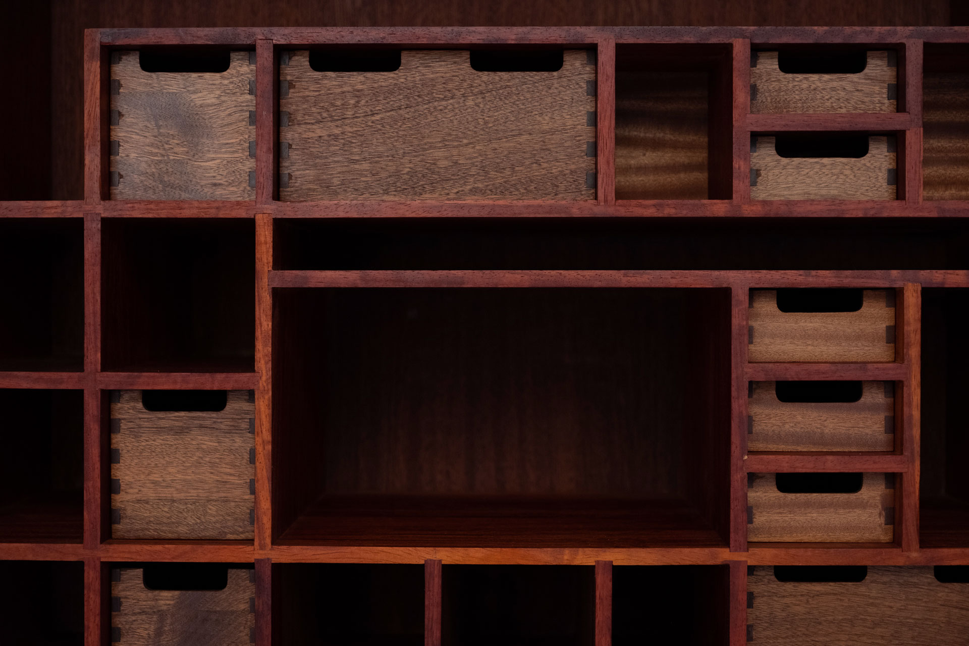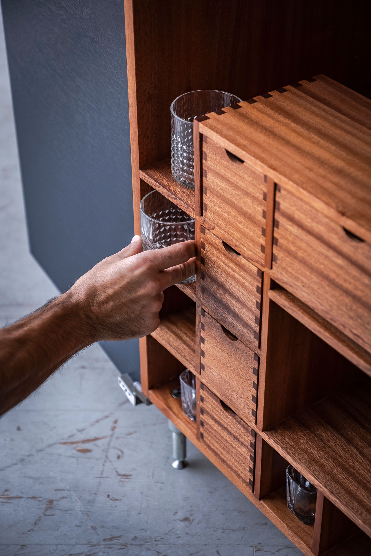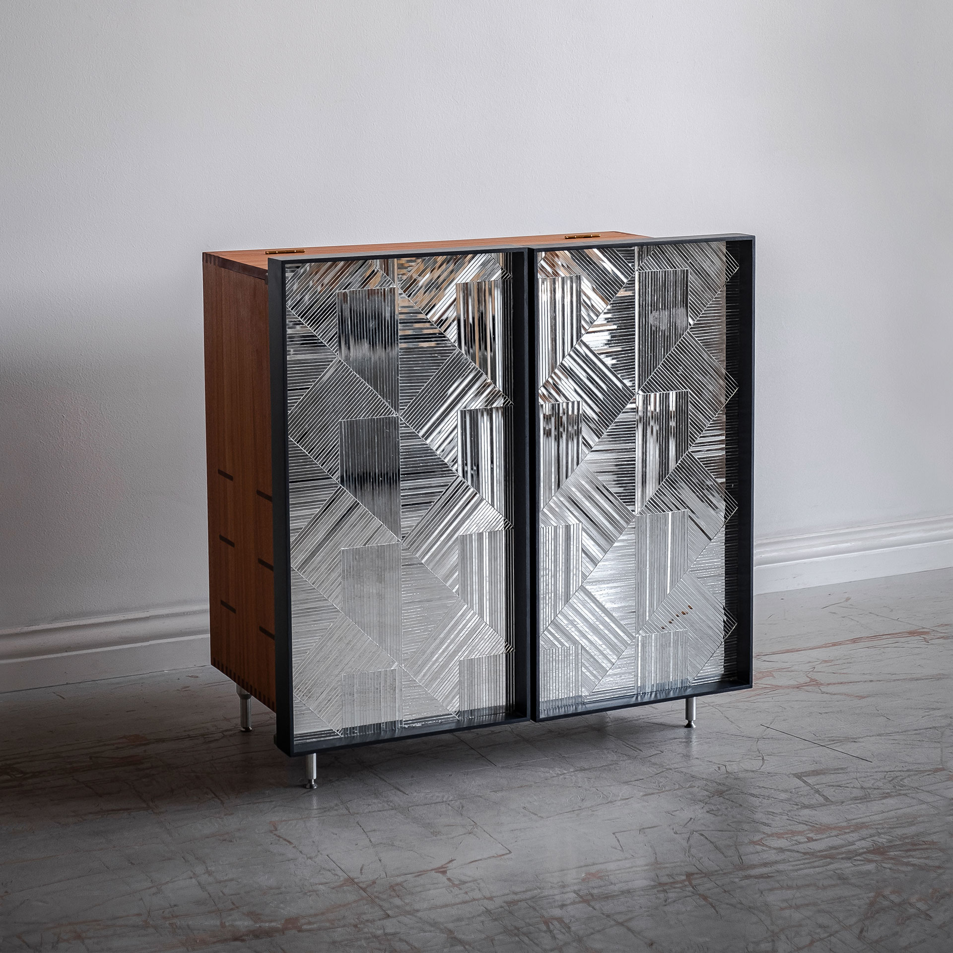 Ayyine Kari (mirror work) is an Iranian traditional craft. Craftsmen cuts mirror with their hands and stick pieces on a surface. This technique was used for adorning holy shrines in the past. Hand-crafted storage (home-bar) adorned with “ Ayyine Kari ”.