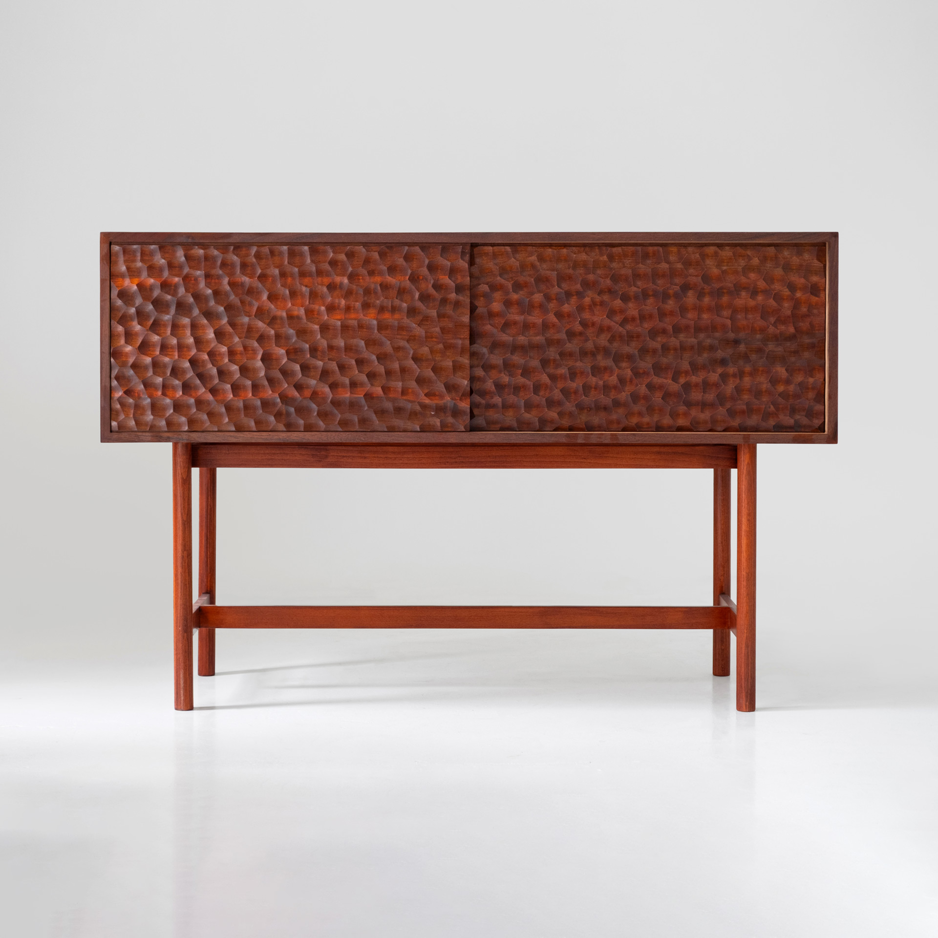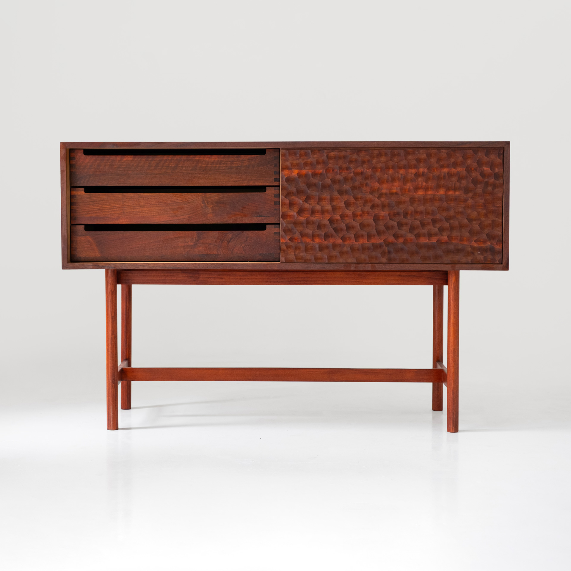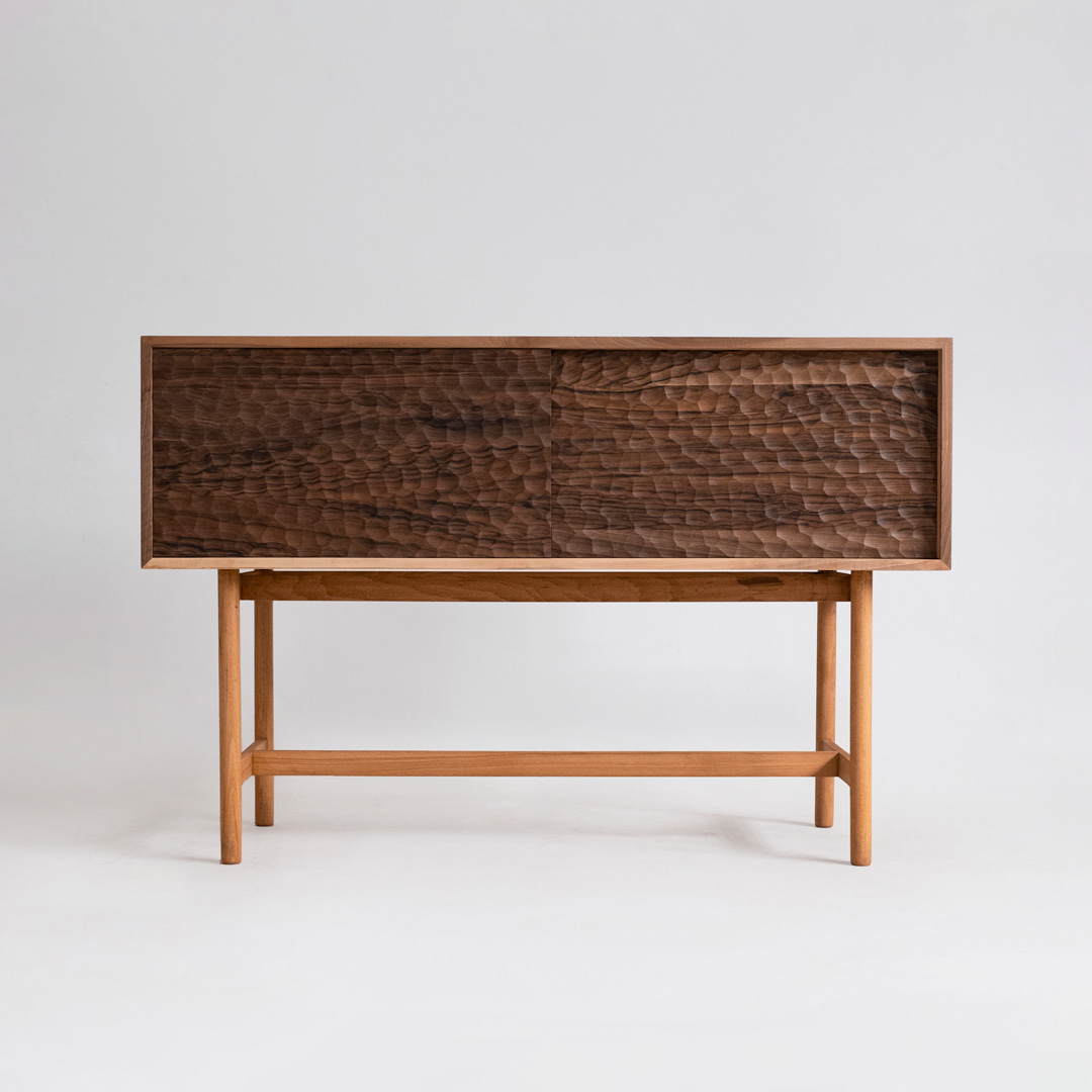 Sabalan Console is crafted from solid walnut wood with a walnut veneer body.It features three internal drawers, each 10 cm high, designed for better organization. The sliding doors, made entirely of walnut and finely machined on the surface, offer a combination of elegance and user-friendly functionality.