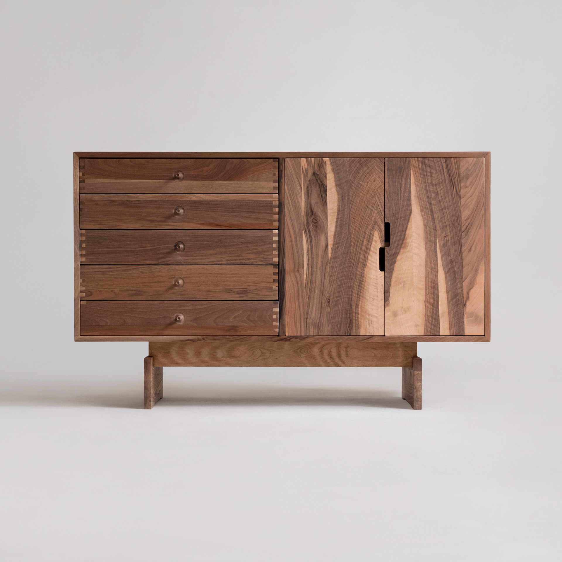 The doors, drawers, and legs are crafted entirely from solid walnut, paired with a walnut veneer body for a cohesive look.