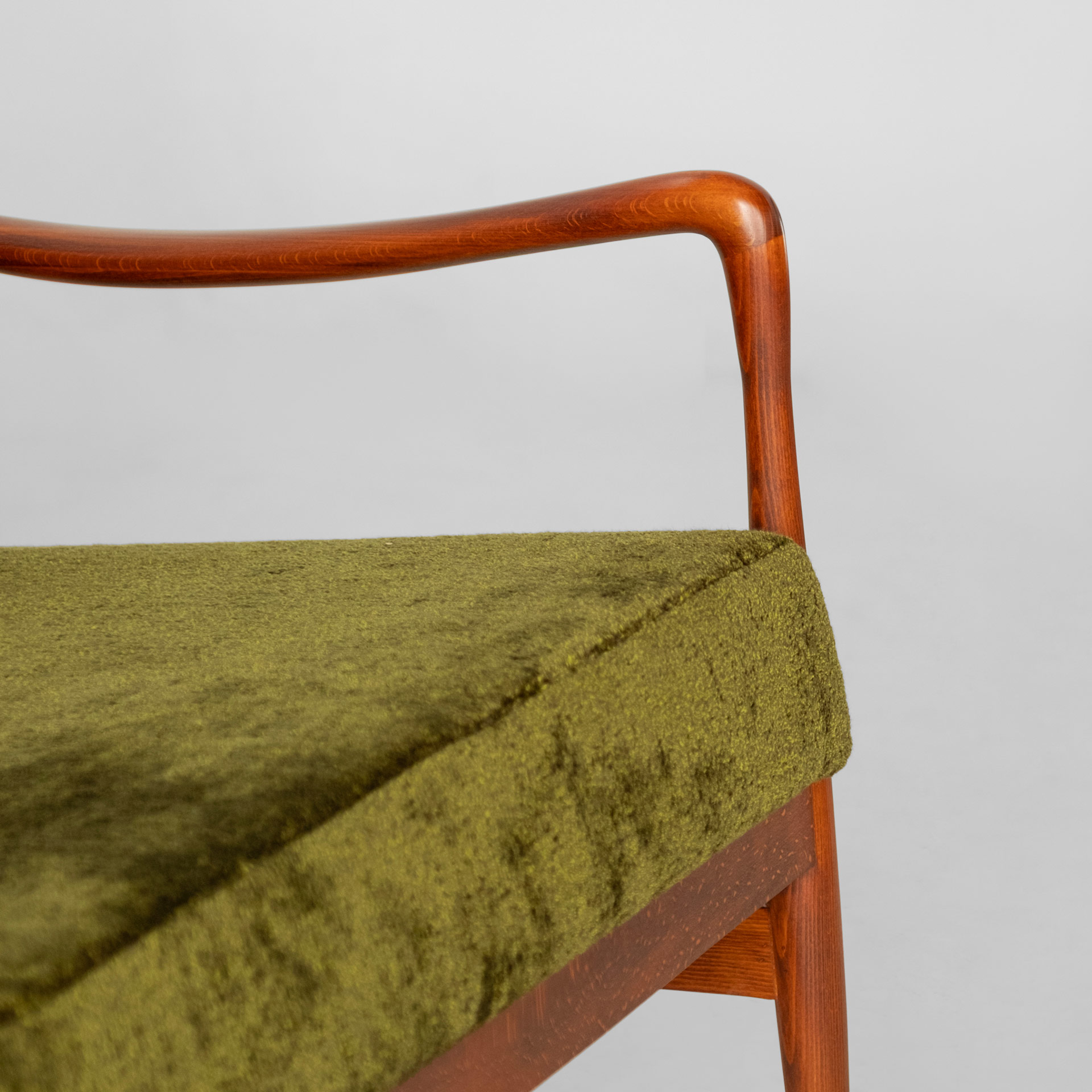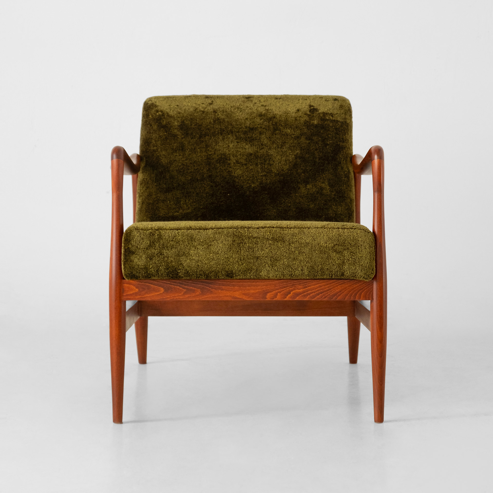The main highlight in the construction of this sofa is the connection of the wooden armrests to the cylindrical legs.