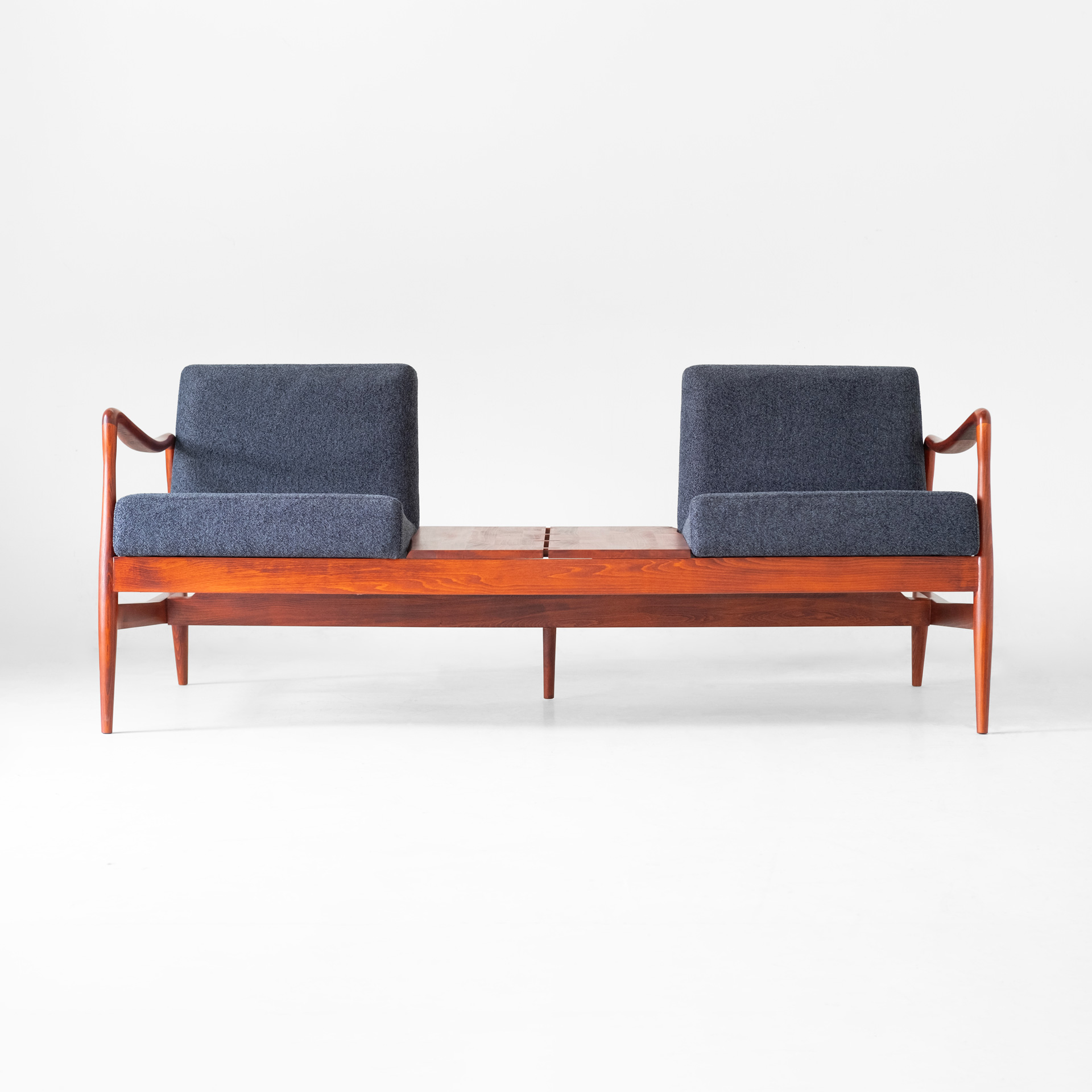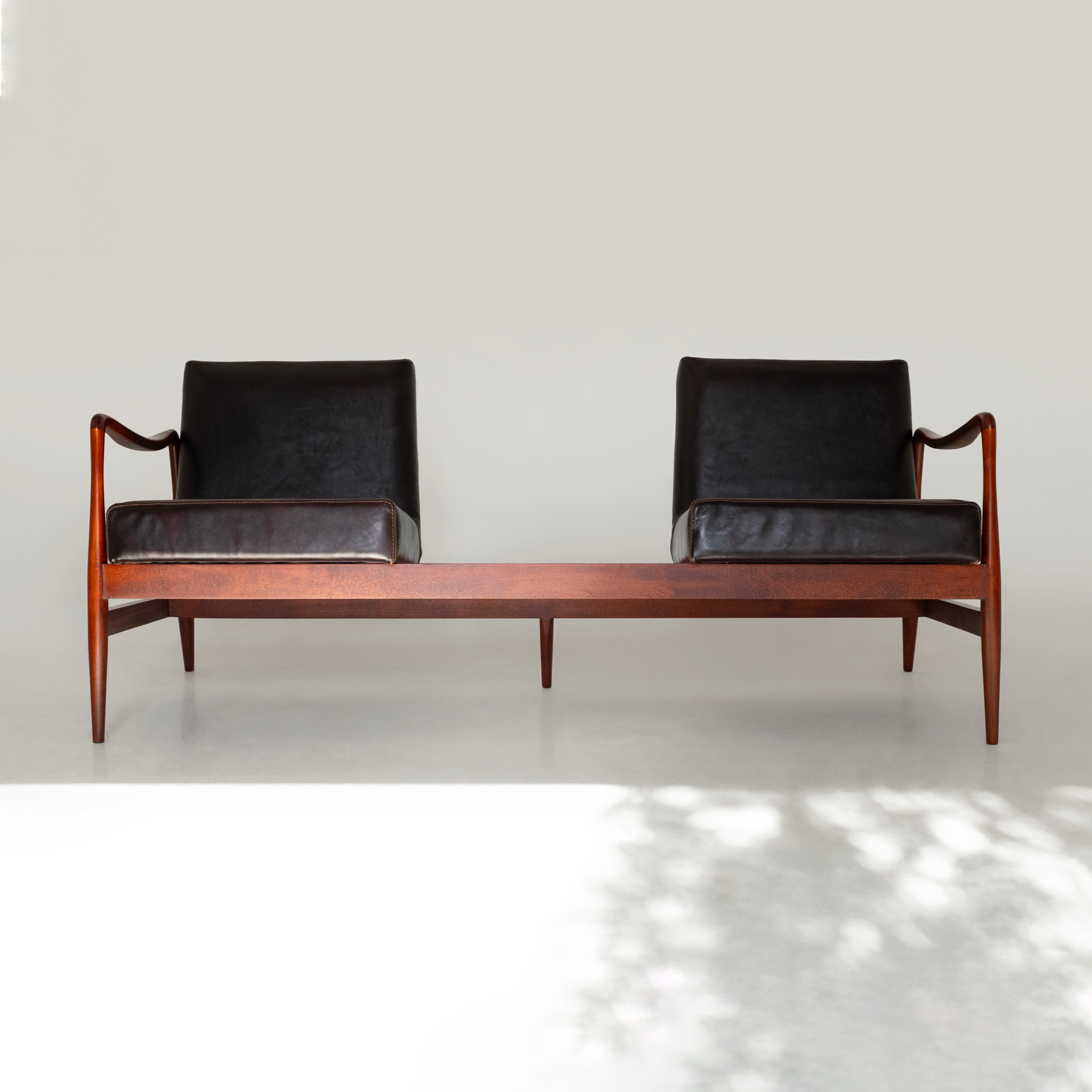 The key feature in the construction of this sofa is the way the wooden armrests are connected to the cylindrical legs. The armrests are first shaped using advanced machinery, and then, through several stages of meticulous hand-finishing, they achieve their final form.
