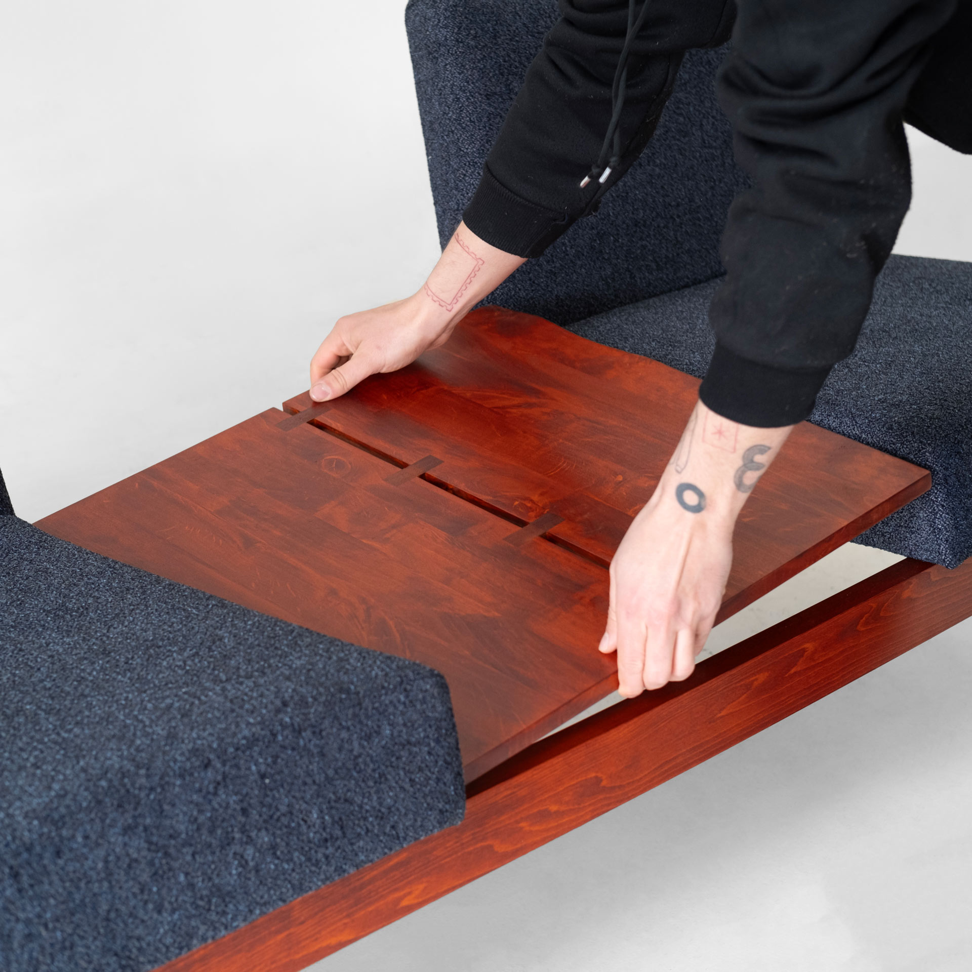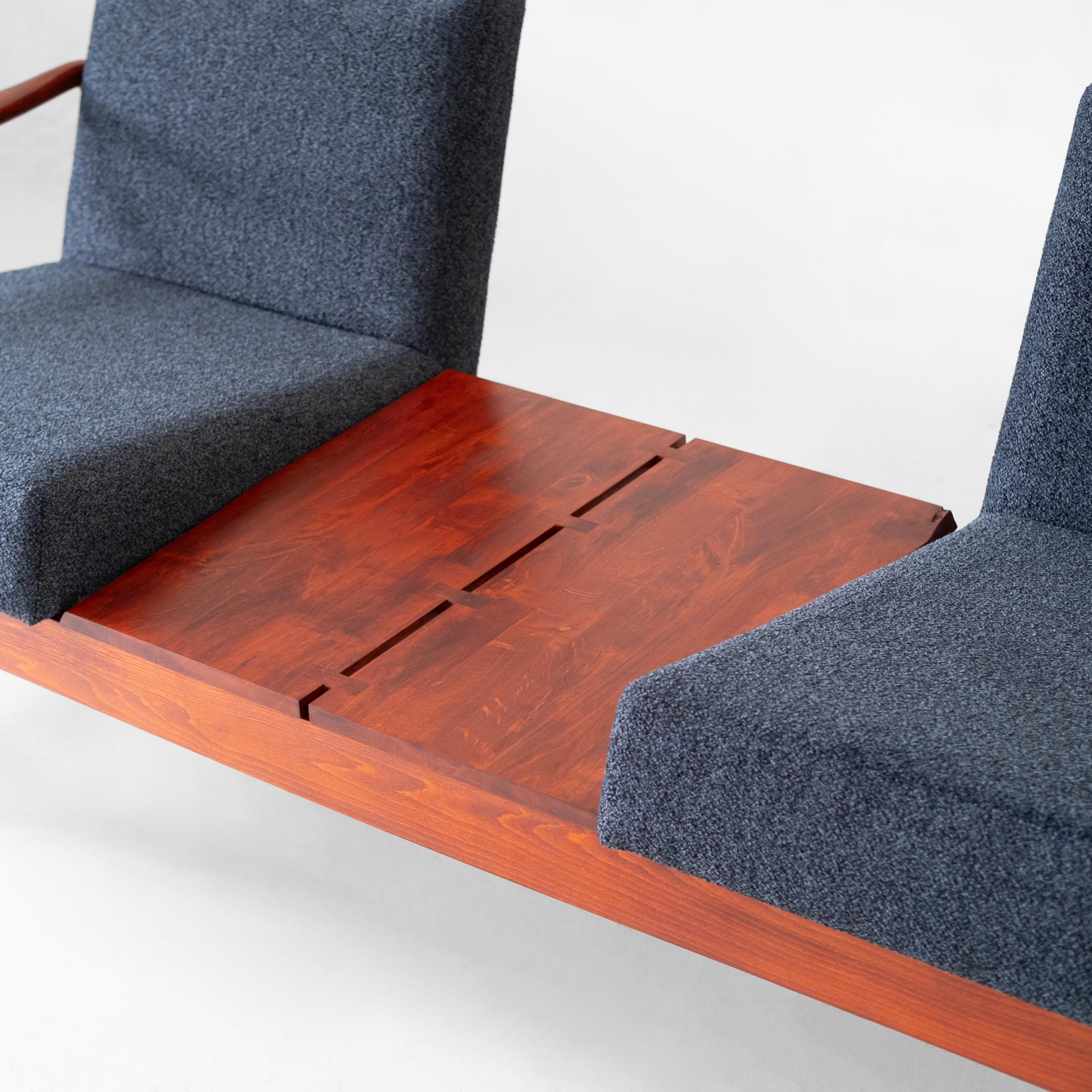 نكته اصلى در ساخت اين مبل، اتصال دسته هاى جوبى به پايه هاى استوانهاى است. دستهها ابتدا با دستگاه هاى پيشرفته برداشت اوليه مىشوند و در نهايت طى چند مرحله برداخت دستى، فرم نهايى مى گيرند.
